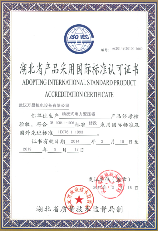 湖北省產(chǎn)品采用國際標(biāo)準(zhǔn)認(rèn)可證書(油變)